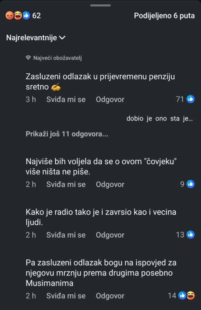 Ako netko misli da su neki novinari odvratni, treba baciti oko na društvene mreže i još odvratnije veselje svakodnevnih ljudi. Nedostatak empatije jednih bio je čak manje strašan od veselja drugih. Ispod gotovo svake objave smo, uz očekivane komentare tuge i šoka, također čitali izražavanje zadovoljstva ovim činom.